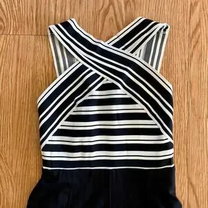 Effortlessly chic, this Anthropologie Maeve Crosswise dress features a striking black and white bandage-style striped bodice with a halter-inspired neckline. Perfect for both casual and dressy occasions, from brunch to evening events.