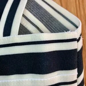 Features & Color & Closure: Black and white crosswise stripe bodice, black flare skirt, sleeveless, halter-esque neckline, two side pockets, side zip closure