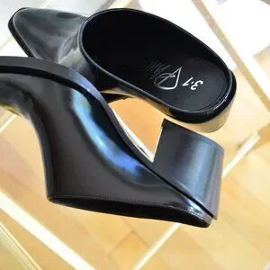 Sleek black mules with a glossy finish. Slip-on design. Perfect for a chic look.