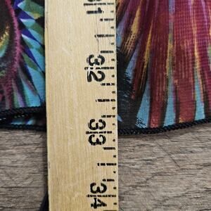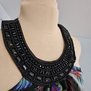 Features: Vibrant peacock feather pattern, tiered ruffles, sleeveless halter neckline, intricate black beaded detail, button closure at back of neck, lightweight flowy fabric