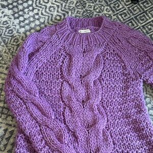Elegant lavender sweater with intricate cable knit. Soft and warm for any season.