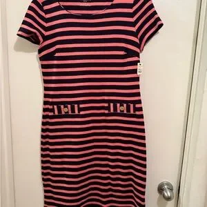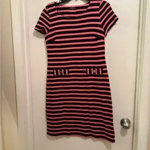 Elegant mini dress with bold pink and black stripes. Perfect for casual outings.