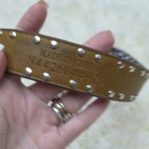 Charming brown belt with silver heart details. Features an ornate silver buckle. Ideal for adding elegance to your look. Gems missing on a few, pictured.
