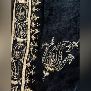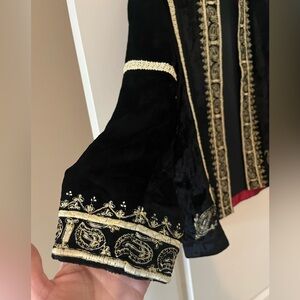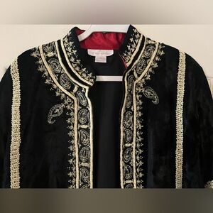 Luxurious black jacket with intricate gold embroidery. Elegant design with ornate patterns. Perfect for a sophisticated look. Asian style. Feels like velvet, very soft. Stand out piece. Designer, Soft Surroundings. Rayon with polyester lining. Red detail. Smoke free home, measurements in photos, runs large based on measurements.. women’s size small. Open jacket, no closure.