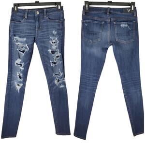 ITEM: American Eagle 360 Super Stretch Distressed Jeggings - Zipper fly, button closure, front/back pockets, whiskering/fading detailing.