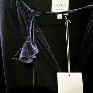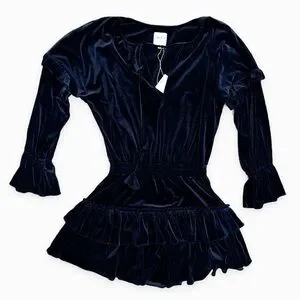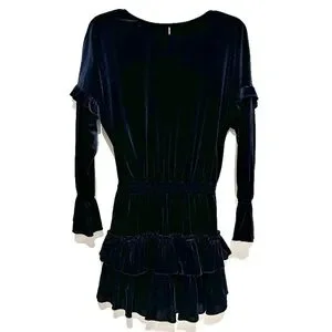 This velour mini dress features a 3-tiered ruffle skirt and long sleeves. It has a V-neck with front ties. It’s made of a polyester/spandex blend, giving it plenty of stretch. Navy blue. Size XS.