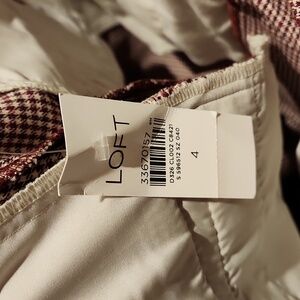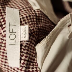 ❤️ NWT! LOFT HIGH RISE CURVY SUTTON SKINNY PANTS IN MINI HOUNDSTOOTH, 4 (27) maroon, brown, cream. Zipper fly with button. Stretchy. Measurements are approximate and taken laying flat: 27" inseam, 15" across waist laid flat, 9.75" rise. Excellent condition!