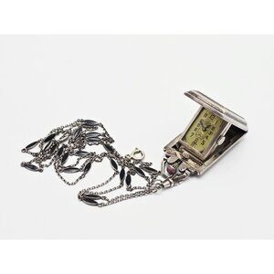 Up for sale is a beautiful vintage Art Deco sterling silver pendant watch necklace featuring elegant black and purple guilloché enamel detailing. The rectangular locket-style pendant opens to reveal a small watch inside, combining function with timeless style. The chain is accented with black enamel marquise-shaped stations, adding extra Art Deco flair.
