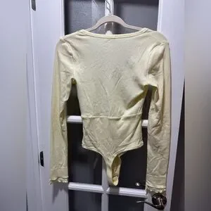 Features: Pointelle fabrication, plunging neckline, long fitted sleeves, and a button gusset.