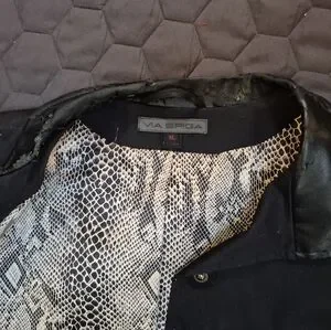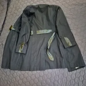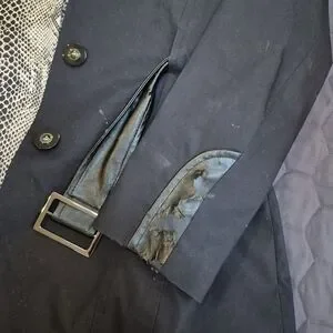This is a tough one it's in excellent condition EXCEPT the glaringly obvious pleather accents which are peeling. You can choose to peel off or replace with an accenting fabric that doesn't peel. The belt is also pleather. It's one a few things my mom kept in great condition (pleather just ages poorly.) Some raincoats have to be taken to a dry cleaner, this one can get popped right in the washing machine. I don't even mind dedicating a long afternoon to peeling the pleather myself for an agreement beforehand, and a full price purchase. This fabulous coat has a long life left to live! I can imagine this with velvet accents in place of pleather.
