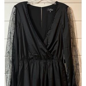 Lulu's Elegant Black Lace-Trimmed Satin Romper