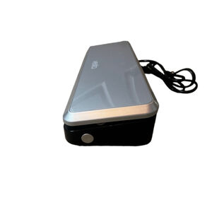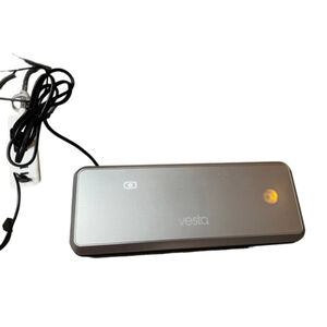 Vesta Vac ‘n Seal Silver Food Vacuum Sealer. Preserves food 5 times longer than zipper bags and containers. Automatic sealing with built in pressure sealer. Easy to clean with removable liquid slot. Dry and moist food options. Automatic and manual vacuum modes. Product is in great working condition as shown in pics with buttons lit up while plugged in. Has some scratches from use.