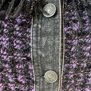 Elegant tweed dress with a black and purple design. Features textured details.