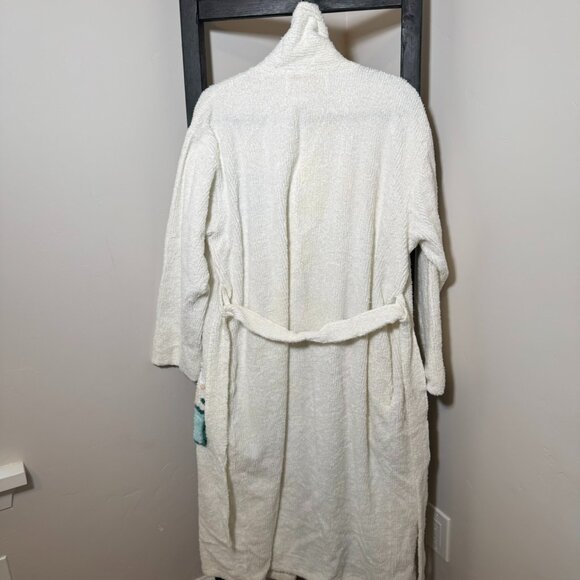 Stan Herman vintage chenille robe • white with multicolor embroidered coffee cups • OSFM (best fits L–XL) • shawl collar • tie belt.