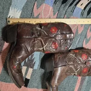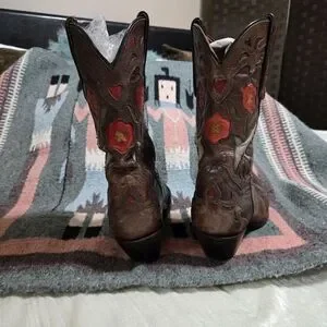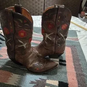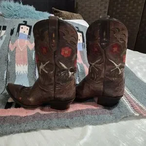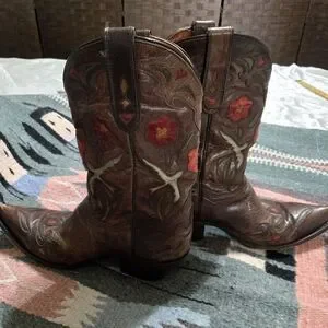 Vintage leather and cut-out details give these Dan Post Blue Bird women’s western boots premium cowgirl style. These women’s cowboy boots feature a goat leather upper with blue bird and floral underlays for unique style. The Ultimate Flex cushioned footbed of these western boots for women features three layers of cushioning and support for odor control and shock absorption. These women’s boots are finished with a leather sole and a medium cowboy heel for a sophisticated look. See all photos for wear..Reasonable offers considered!