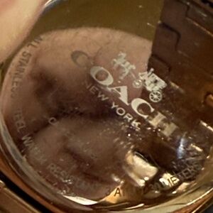 Gorgeous Rose Gold plated, stainless steel Coach watch. Features a stylish round face with chronographic details. Mineral crystal, Quartz movement and deployment closure, and water resistant up to 99 feet. Average wear on the back, but in great condition, works perfectly with brand new battery.