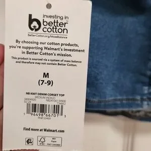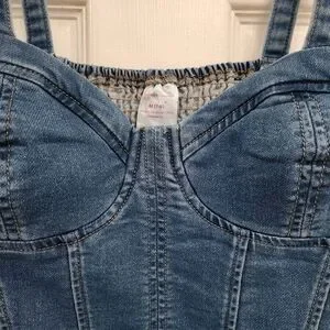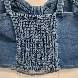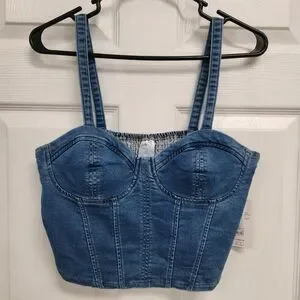 Chic denim corset top with bustier style. Features structured cups. Ideal for casual outings.