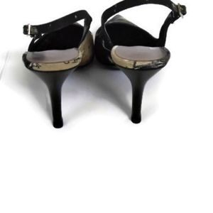 Elegant slingback heels with a pointed toe. Features a black and gold pattern. Perfect for evening wear.