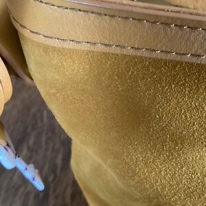 This Fossil bucket bag is gold suede with leather shoulder strap. Zips on top and stands 9” high, 9” wide with a 7” oval bottom. Goes well with all the fall colors!