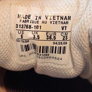 Women's size 6, Nike Musique (2009), dance/cheer shoe. White with a metallic swoosh and pink stitching.