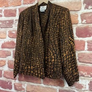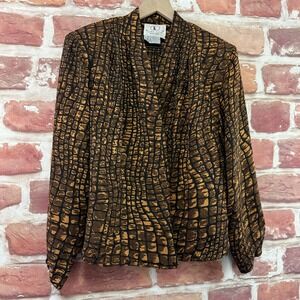 VTG Flora Kung Top Shirt Womens 10 Brown Black Abstract 100% Silk Casual Career