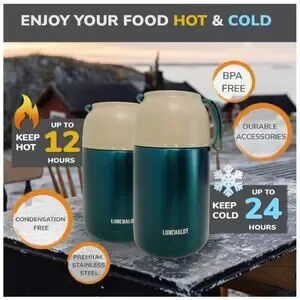 VACUUM TECHNOLOGY: lunchalot 21 oz & 15 oz green food jares utilize advanced vacuum insulation technology to keep your food or drink hot for up to 12 hours and cold for up to 24 hours, ensuring that your meals stay at the perfect temperaturePREMIUM FOOD JARS: Crafted with high-quality 304 stainless steel and BPA-free plastic lids, our food jars are designed for durability and safety; The convenient air pressure release button makes opening the jar effortlessBOX FOR HOT FOOD: Our green insulated food storage container is not just for soups; It's a versatile solution for keeping a variety of meals fresh and warm, making it an excellent alternative to standard lunch containersSOUP CONTAINER FOR ADULTS: Whether you're at work, traveling, or hiking, our compact hot food containers are designed with adults in mind; The set also includes a lunch bag for added convenience and portabilityHEALTHY FOOD DIET: Promote healthy eating habits with our set of 2 food jar; It's perfect for men and women who want to enjoy warm and nutritious meals on the go, making it an ideal choice for work, travel, and camping adventures