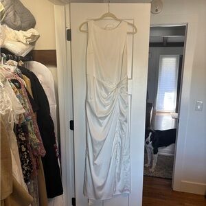 Slim-fitting maxi dress in our stretch-enhanced satin fabric, featuring draping details along the bodice, open-back detail, flattering knotted waist detail and thigh-high slit detail. Imported.