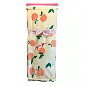 Wrap yourself in luxurious comfort with this Juicy Couture plush throw blanket adorned with delightful peaches! Crafted with ultra-soft material, this blanket is perfect for cozy nights in or adding a touch of chic charm to any room. Whether you're snuggling up on the couch or adding a stylish accent to your bed, this Juicy Couture throw is sure to elevate your space. Indulge in the sumptuous softness and playful design of this must-have accessory!
