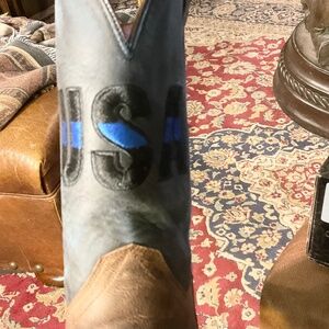 Salute law enforcement by wearing the Thin Blue Line boot. Handcrafted with distressed leather. The shaft is navy blue and features embroidered patches on the front and back. A black and white American flag is striped with blue to represent the line that officers protect between chaos and peace. The Thin Blue Line flag is often worn to honor fallen officers.