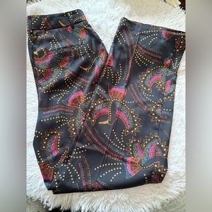 Chic wide leg pants with a striking pattern. Features pink and gold details on a black background. Ideal for a standout look.