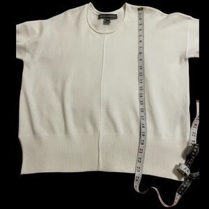 Experience comfort and style with this versatile white sweater. A great wardrobe staple that’s perfect for almost any occasion, this sweater offers a soft touch and elegant look. Rolled neckline and center design finishes. Ribbed cuffs and hemline with 4 inch side slits. Tag reads XS, however based upon approximate measurements laying flat, this could also easily fit a size Small. Purchased at Nordstrom.