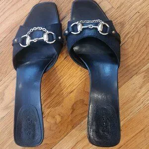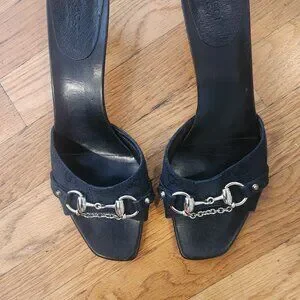 Experience luxury with these Gucci black heels, featuring a signature monogram print and elegant silver-tone horsebit hardware. The slip-on mule design and moderate kitten heel height offer both style and comfort, making them perfect for formal occasions.No original box. Please look at pics carefully.