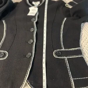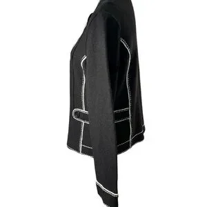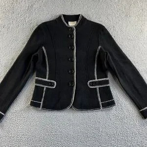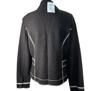 Elegant black wool coat with button-up design. Features contrasting white trim.