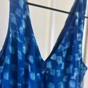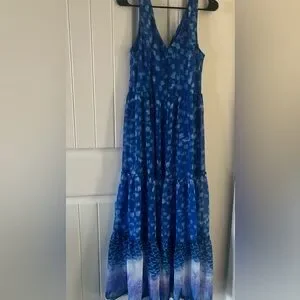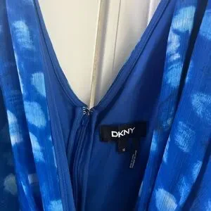 Chic and flowing maxi dress by DKNY. Features a vibrant blue pattern. Perfect for any occasion.