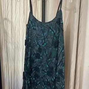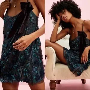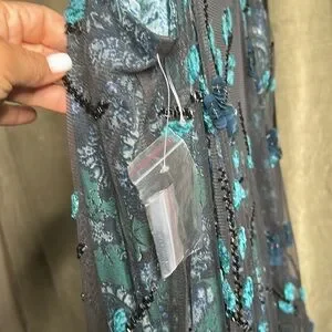 This stunning slip dress features intricate blue embellishments on a classic black base, perfect for a night out or a special occasion. The elegant design and comfortable fit make it a must-have addition to your wardrobe.