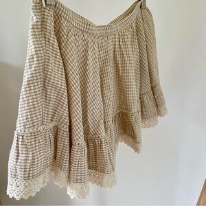 cream plaid, gingham pattern, ruffle hem, lace trim, mini skirt, cotton fabric, neutral tones, feminine detail, summer skirt
