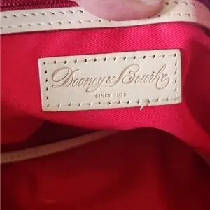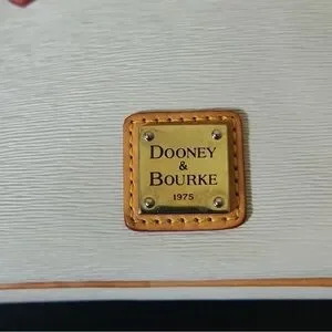 Elegant white crossbody bag. Features tan leather accents. Classic Dooney & Bourke style.