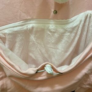 Cozy pink hoodie featuring playful pom poms and embroidered paw prints. Has ears on the hood, and large snap-closure pocket for carrying your furry babies! Worn once for a cat-themed costume.