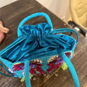 This stunning turquoise handbag features intricate beadwork and vibrant floral embellishments. Perfect for adding a pop of color to any outfit! I can’t find my receipt so figured will just sell on here. I love it but it doesn’t match anything I have in my closet! My loss is your gain