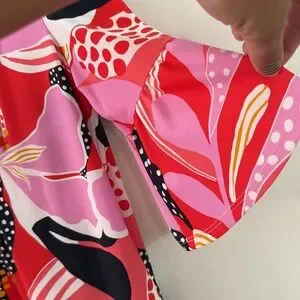 Chic dress with bold red and pink floral design. Accented with black and white polka dots.