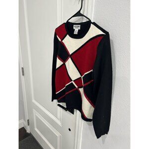The Alfred Dunner sweater is crafted with a blend of acrylic and wool, ensuring warmth and comfort. It features a striking geometric design with red, black, and white accents, offering both style and sophistication. Designed in a petite size, this sweater is a polished addition to a professional wardrobe.