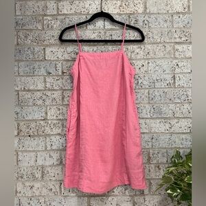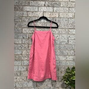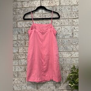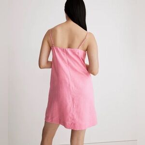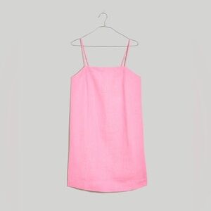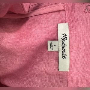 Goldie Mini Dress in 100% Linen size in color retro pink size 2. Color is lighter in real life than in photos due to the lighting in my living room. Most accurate color depiction in the closed up of the Madewell tag photo.