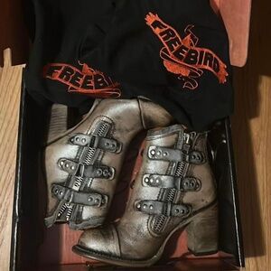 Stylish metallic boots with buckle details. Perfect for a bold look.