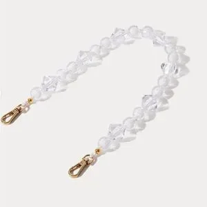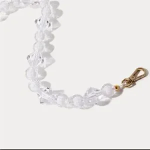 Elegant clear beaded phone strap. Features gold clasp. Perfect for stylish carrying.