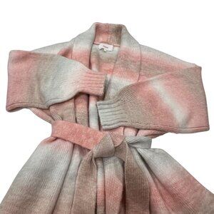 This long cardigan can be worn open or wrap style with a removable self-tie belt, it features a shawl collar, side pockets, drop shoulders, and long full sleeves with ribbed cuffs. Excellent condition, ombre-striped gradient in pink, ivory, and gray. Excellent condition, size small
