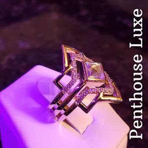 Indulge in the stunning allure of this unique geometric ring. The 18k yellow gold plated band features a captivating zircon center stone, complemented by sparkling white sapphire accents. Perfect for those who want to make a bold and unforgettable statement..