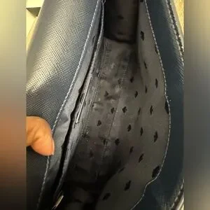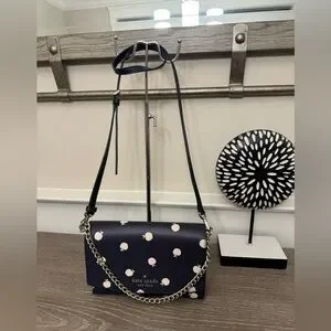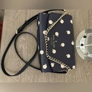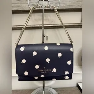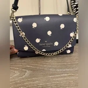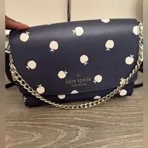Stylish navy crossbody bag with cream apples. Features a gold chain strap. Perfect for any occasion. Excellent used condition