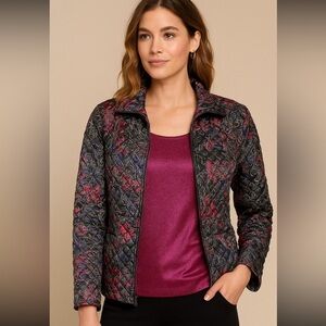 Stylish and versatile Chico’s Travelers two-piece set featuring a shimmering metallic magenta tank top paired with a quilted zip-front jacket in a bold paisley print. The jacket’s pattern combines shades of fuchsia, purple, silver, and black with a subtle sheen, adding depth and sophistication. Both pieces can be worn together for a coordinated look or styled separately for maximum versatility. Perfect for travel, dinner outings, or casual chic layering.