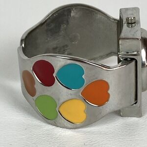 Geneva Platinum Watch Women Silver Tone Open Cuff Enamel Hearts New Battery 6"