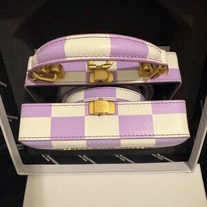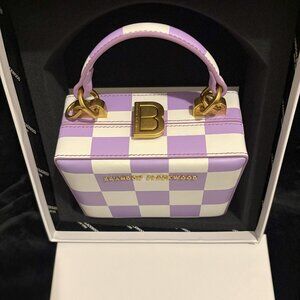 Brandon Blackwood – outside white/purple checkerboard leather, inside fully lined single compartment, top-handle with detachable shoulder strap and gold toned ‘B’ clasp closure and logo,